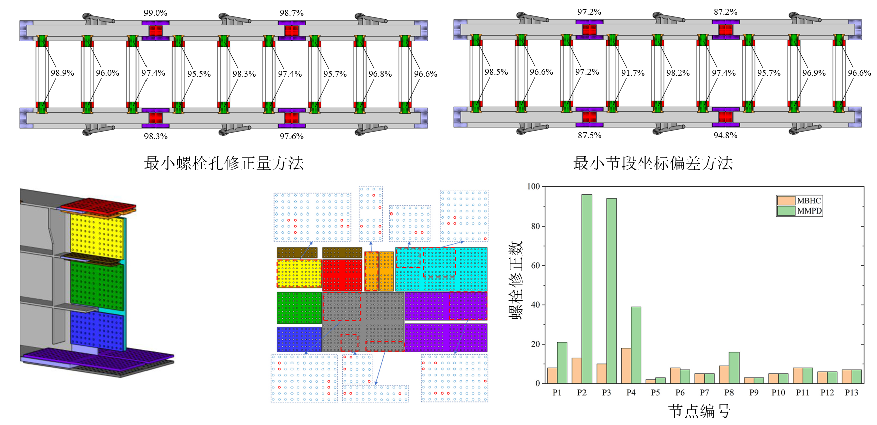 (2) 构件间因制造偏差产生的误差存在传播与累积现象,且可定量分析。基于最小化螺栓孔修正量的预拼装结果显示:最大误差传播量为1.27毫米,最大误差累积量为2.21毫米。误差呈单向单侧传播,累积误差可能相互抵消。